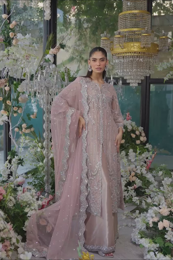 Zella is a captivating formal ensemble crafted in a soft tea pink hue, designed to embody elegance and modern luxury. The front-open shirt is richly adorned with intricate silver handwork, where delicate embroidery and embellishments create a graceful, shimmering pattern across the silhouette. Its refined craftsmanship highlights the beauty of the detailed motifs, giving the outfit a sophisticated and regal appeal. The flowing structure paired with matching bottoms enhances the overall elegance of the design. Completing the ensemble is a dupatta featuring heavily embroidered borders that add depth and grandeur to the look. Zella is the perfect choice for weddings and special occasions, offering a timeless blend of luxury, artistry, and refined charm