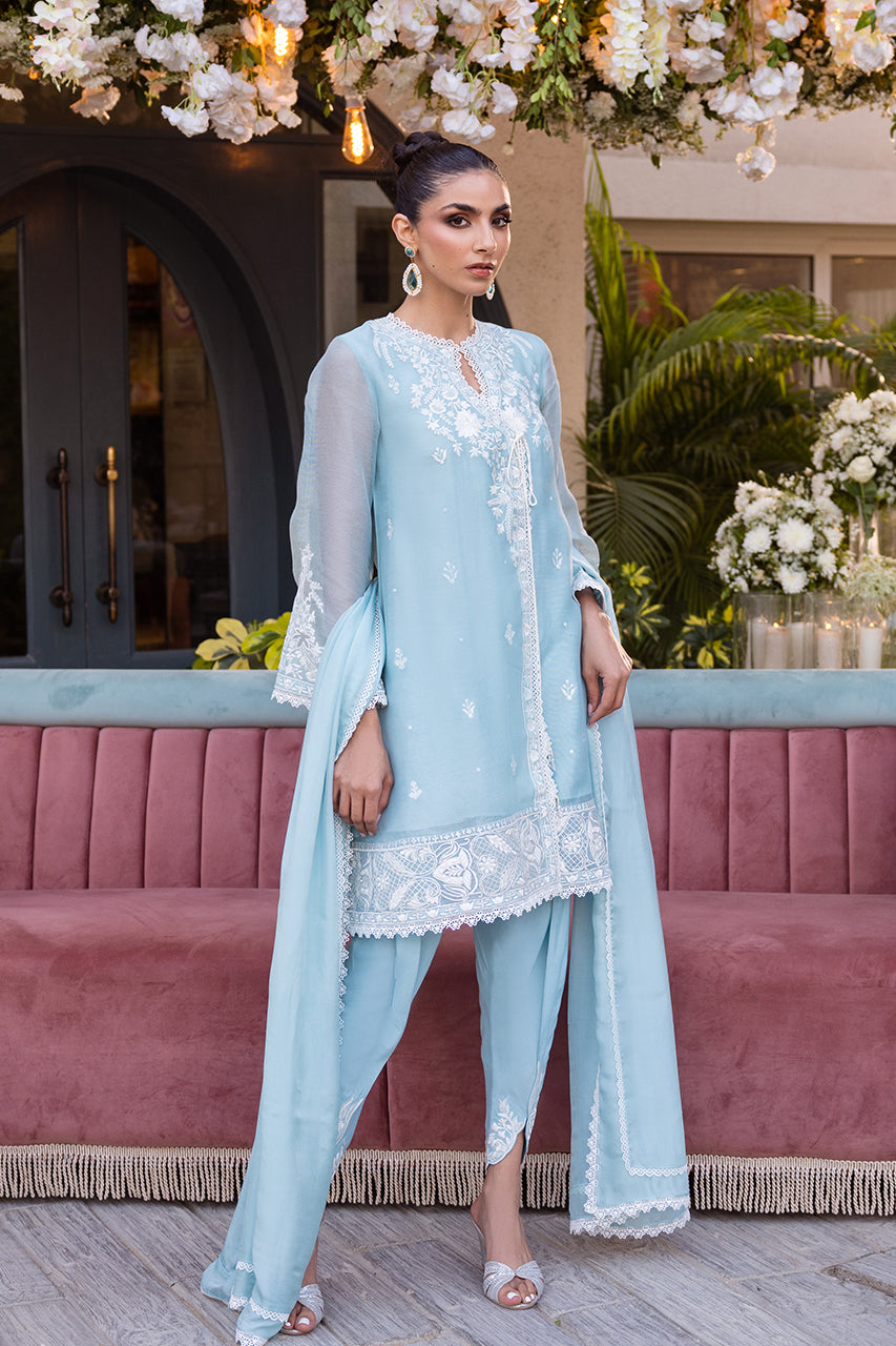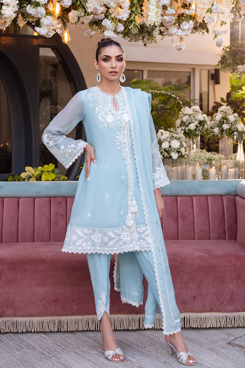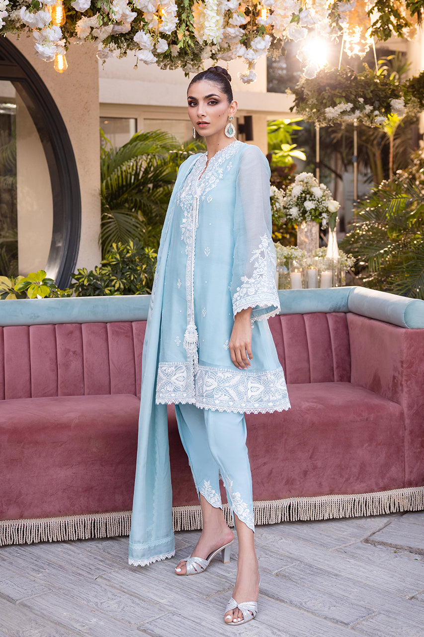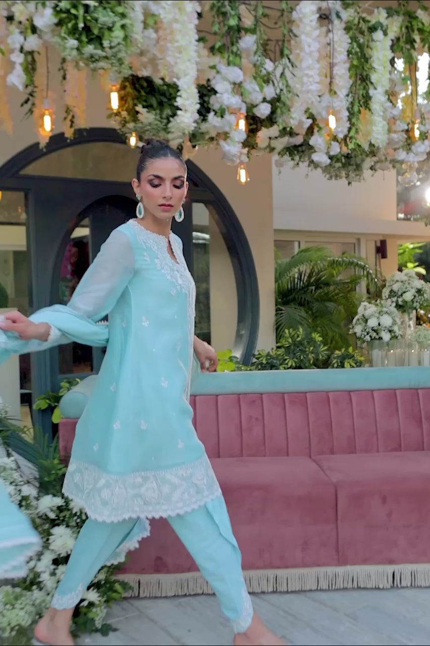 Ziva unveils perfection with its pure cotton net silhouette rendered in a light blue tone. The front open modern styled angrakha shirt is adorned to perfection with floral and geometric embellishment along with stunning hand made tassels on the neckline. The angrakha shirt is paired with tulip pants and a gorgeous silk duppatta with lace work all over, showcasing a perfect blend of style and sophistication.