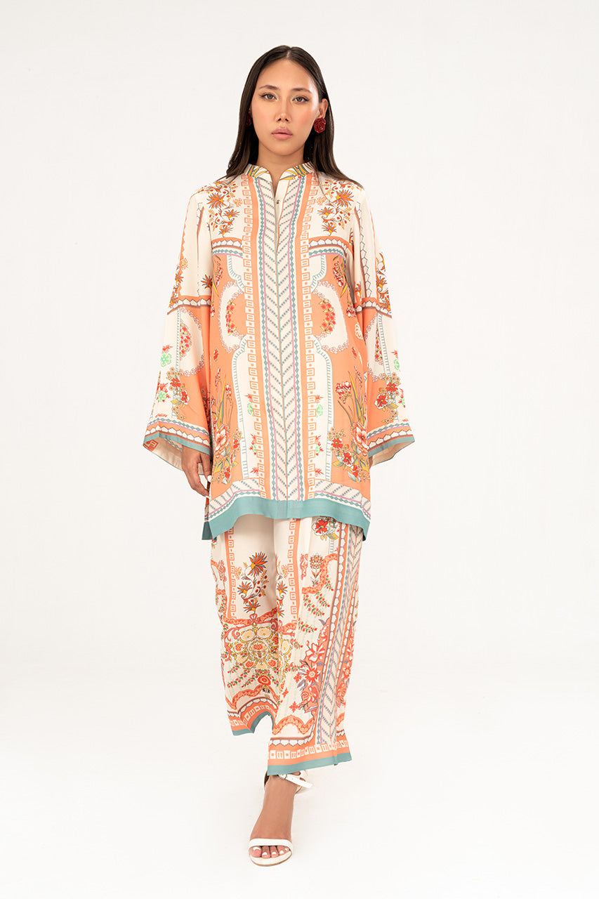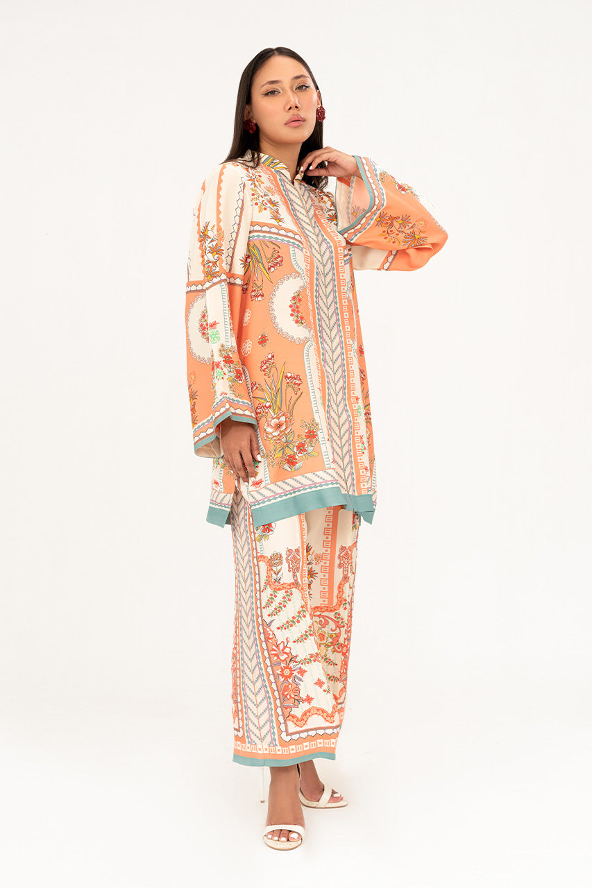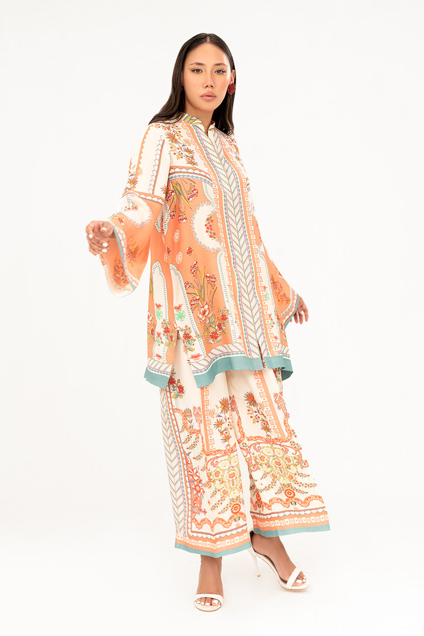 A chic peach white digital silk coord set, highlighted with playful pops of vibrant colors and adorned with unique digital elements that give it a fresh, contemporary edge. The silhouette balances effortless comfort with modern sophistication, making it a versatile choice for both casual elegance and standout style. Radiant, artistic, and full of character, this ensemble is a true statement of modern charm.