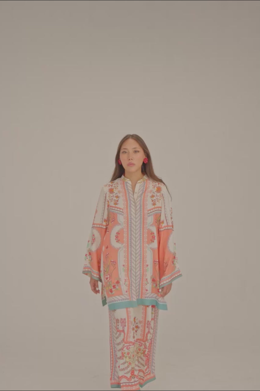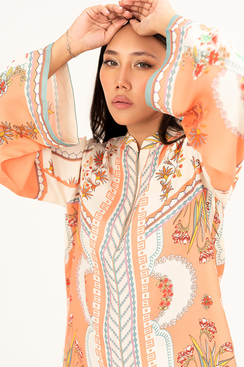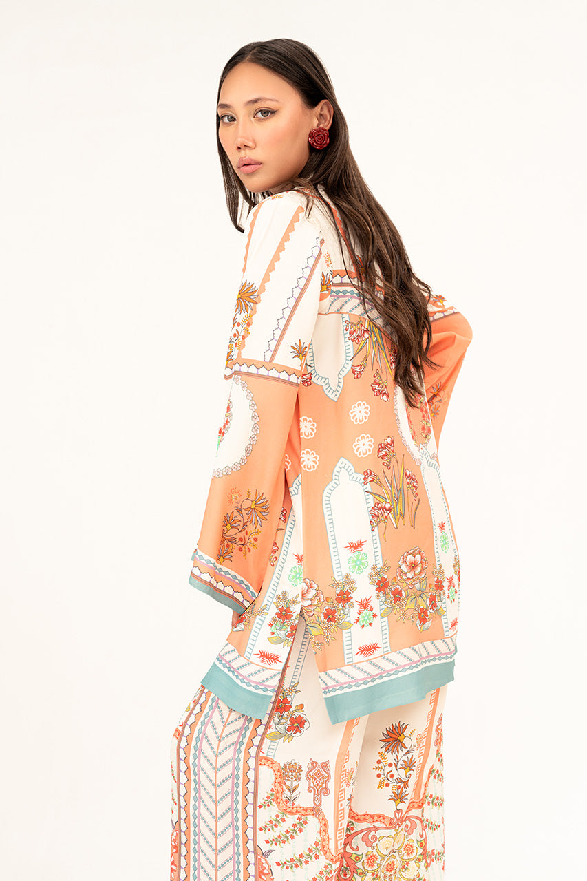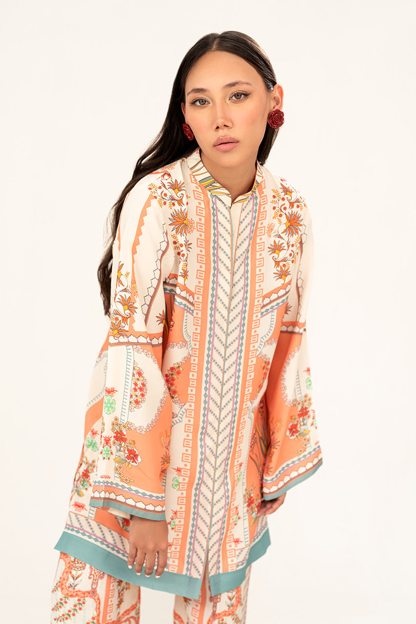 A chic peach white digital silk coord set, highlighted with playful pops of vibrant colors and adorned with unique digital elements that give it a fresh, contemporary edge. The silhouette balances effortless comfort with modern sophistication, making it a versatile choice for both casual elegance and standout style. Radiant, artistic, and full of character, this ensemble is a true statement of modern charm.