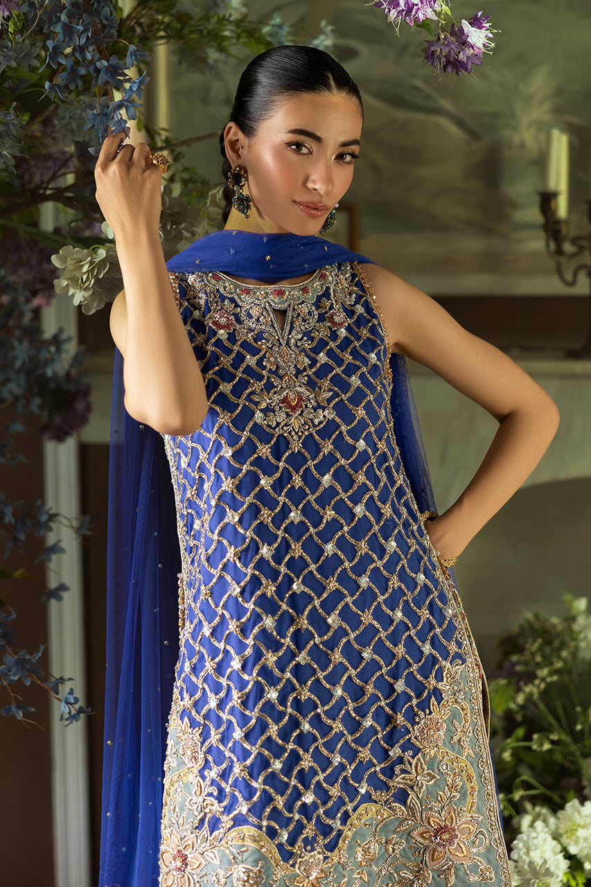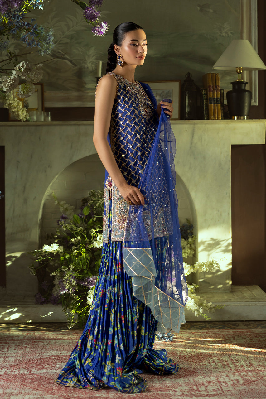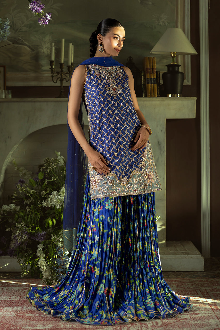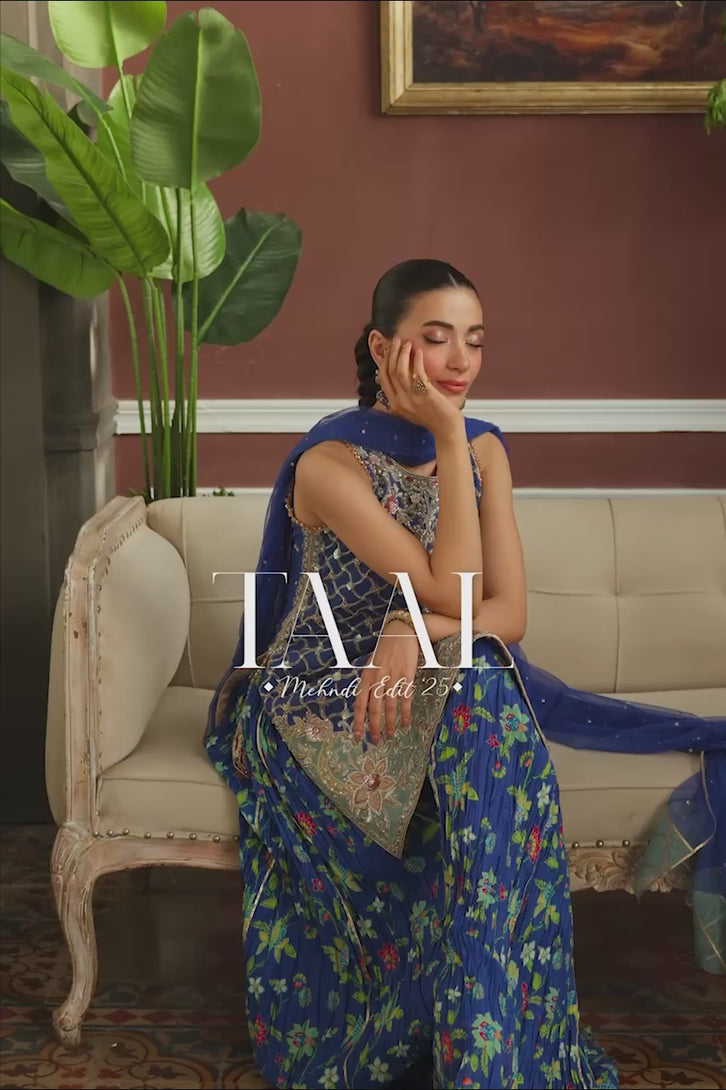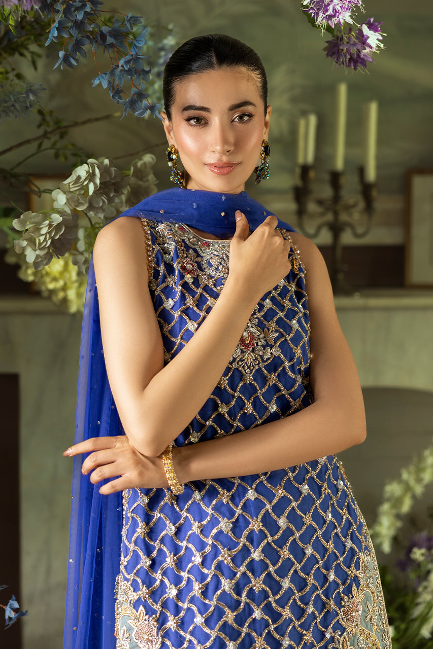 An exquisite fusion of tradition and modern grace, this blue short French net shirt is adorned with elaborate embroidery, blending floral and geometric motifs in a delicate tapestry of craftsmanship. The silhouette is further refined by an artfully designed cutwork back, finished with graceful tassel embellishments that add a touch of fluid elegance. Complementing the ensemble is a pair of crushed Dhaka digital silk , offering a soft, flowing structure that enhances the regal aesthetic. The look is completed with a lightweight French net dupatta, delicately sprinkled with sequin detailing, casting a subtle shimmer and completing the outfit with timeless charm.