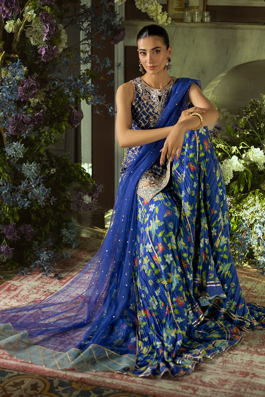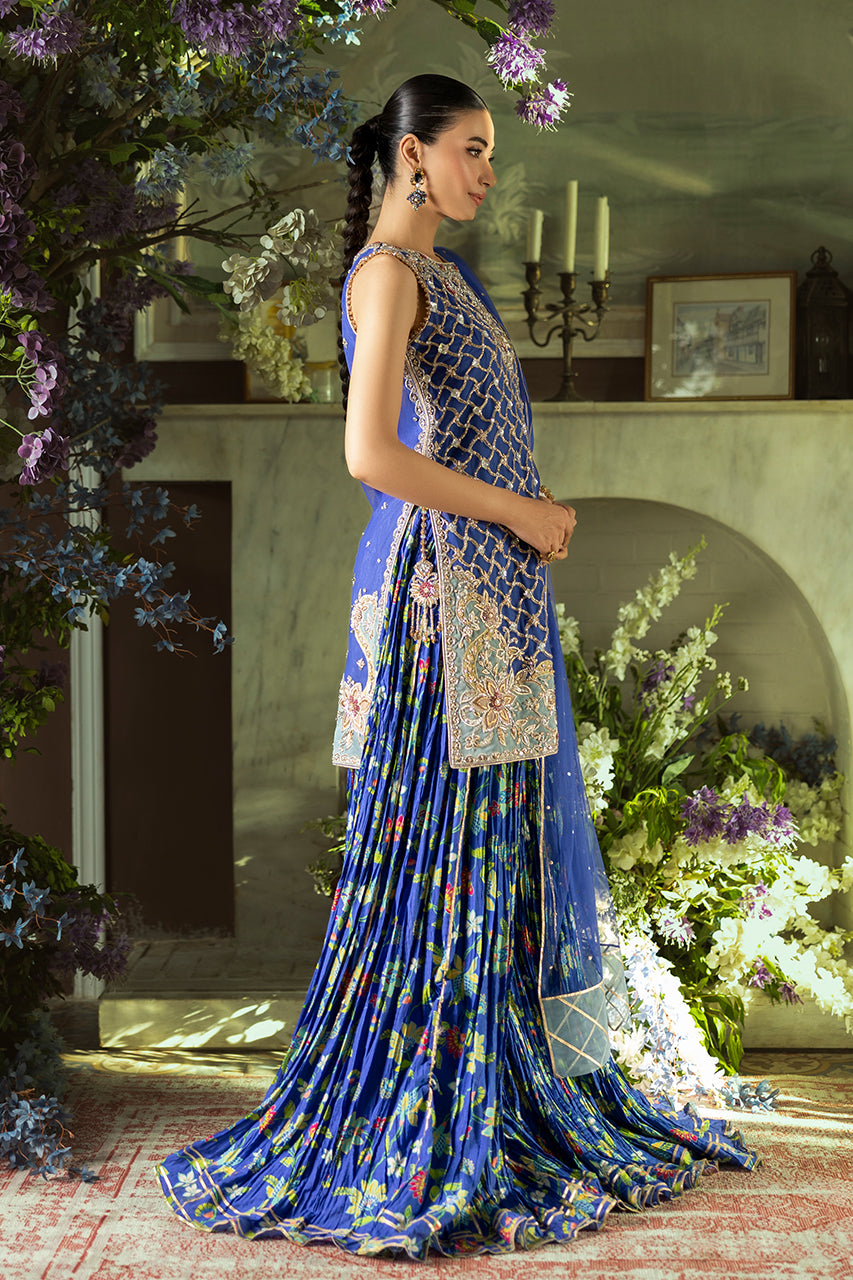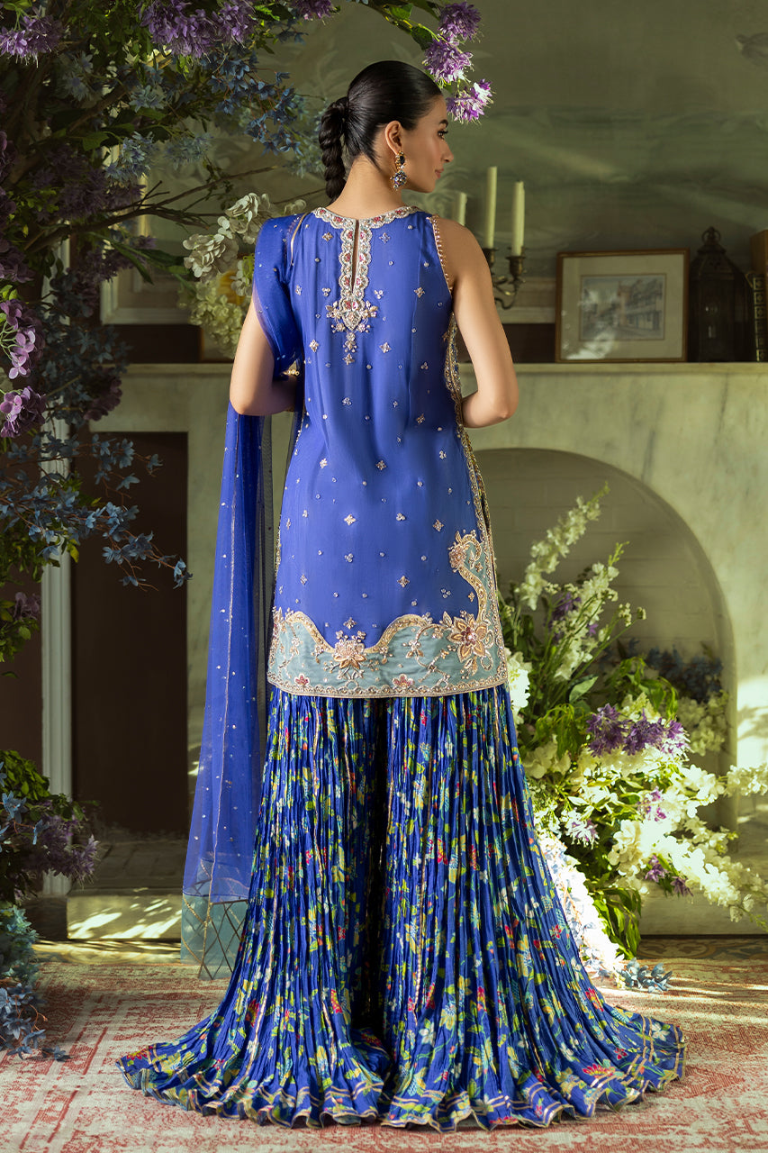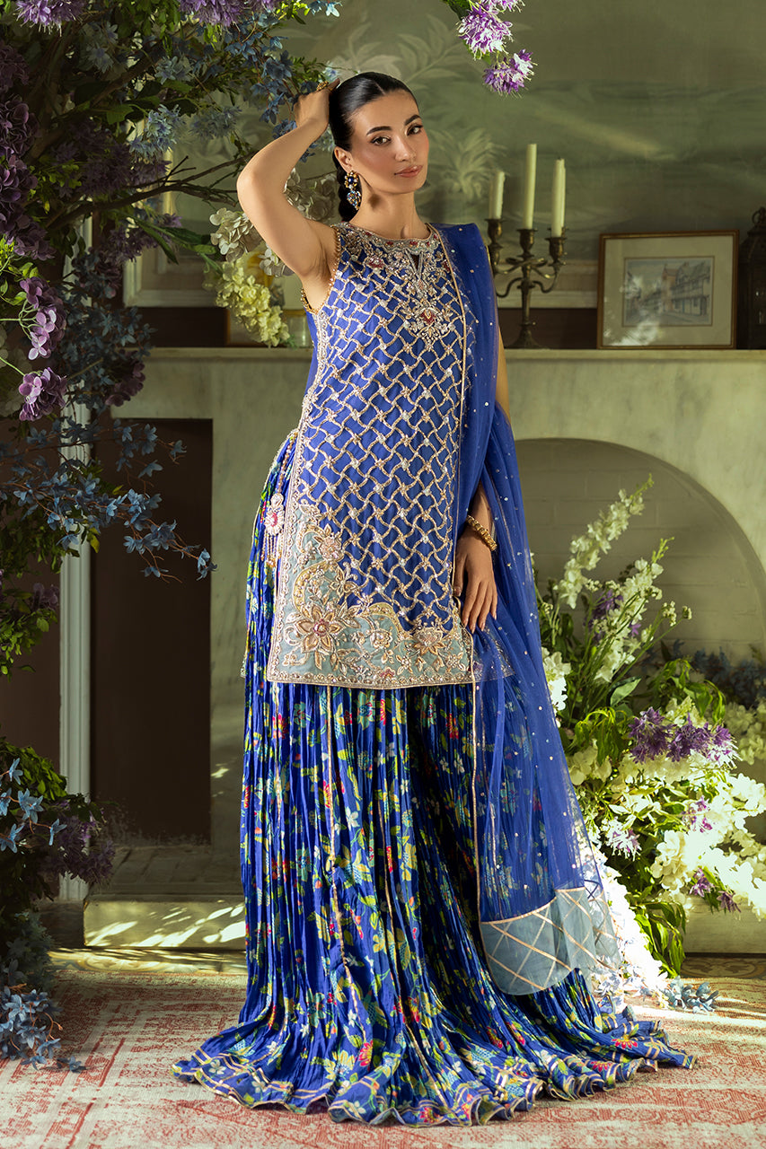An exquisite fusion of tradition and modern grace, this blue short French net shirt is adorned with elaborate embroidery, blending floral and geometric motifs in a delicate tapestry of craftsmanship. The silhouette is further refined by an artfully designed cutwork back, finished with graceful tassel embellishments that add a touch of fluid elegance. Complementing the ensemble is a pair of crushed Dhaka digital silk , offering a soft, flowing structure that enhances the regal aesthetic. The look is completed with a lightweight French net dupatta, delicately sprinkled with sequin detailing, casting a subtle shimmer and completing the outfit with timeless charm.