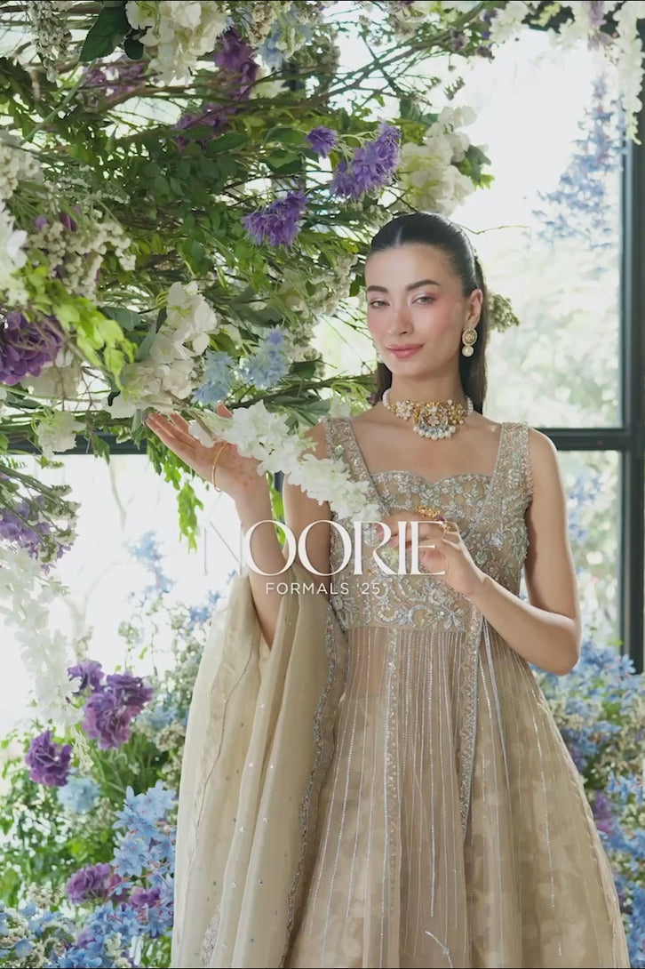An ethereal ivory ensemble featuring a long sleeveless Katan organza gown, adorned with intricate embroidery on the bodice and along the border for a timelessly regal look. It's paired with a self-printed Lama tissue lehenga that adds subtle texture and richness to the outfit. Completing the look is a matching Katan organza ivory dupatta, lavishly finished with detailed embroidery across the border, creating a harmonious blend of grace and sophistication.