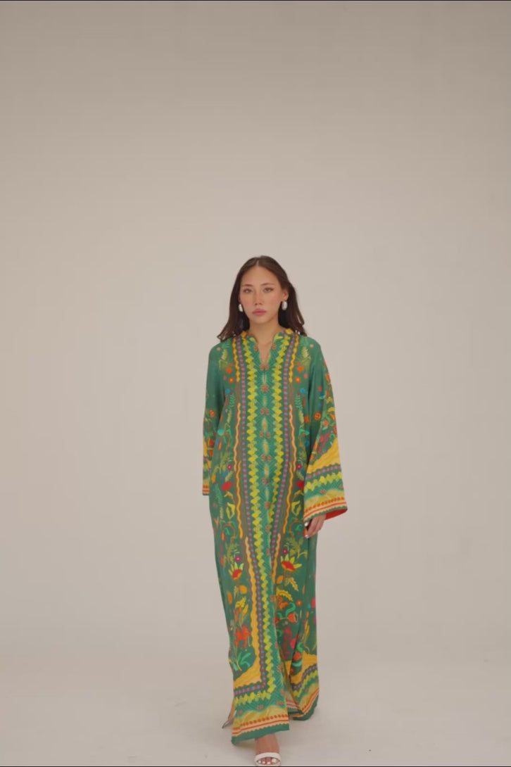 A vibrant green front open digital silk long kaftan, adorned with a lively mix of unique design elements that infuse it with a...